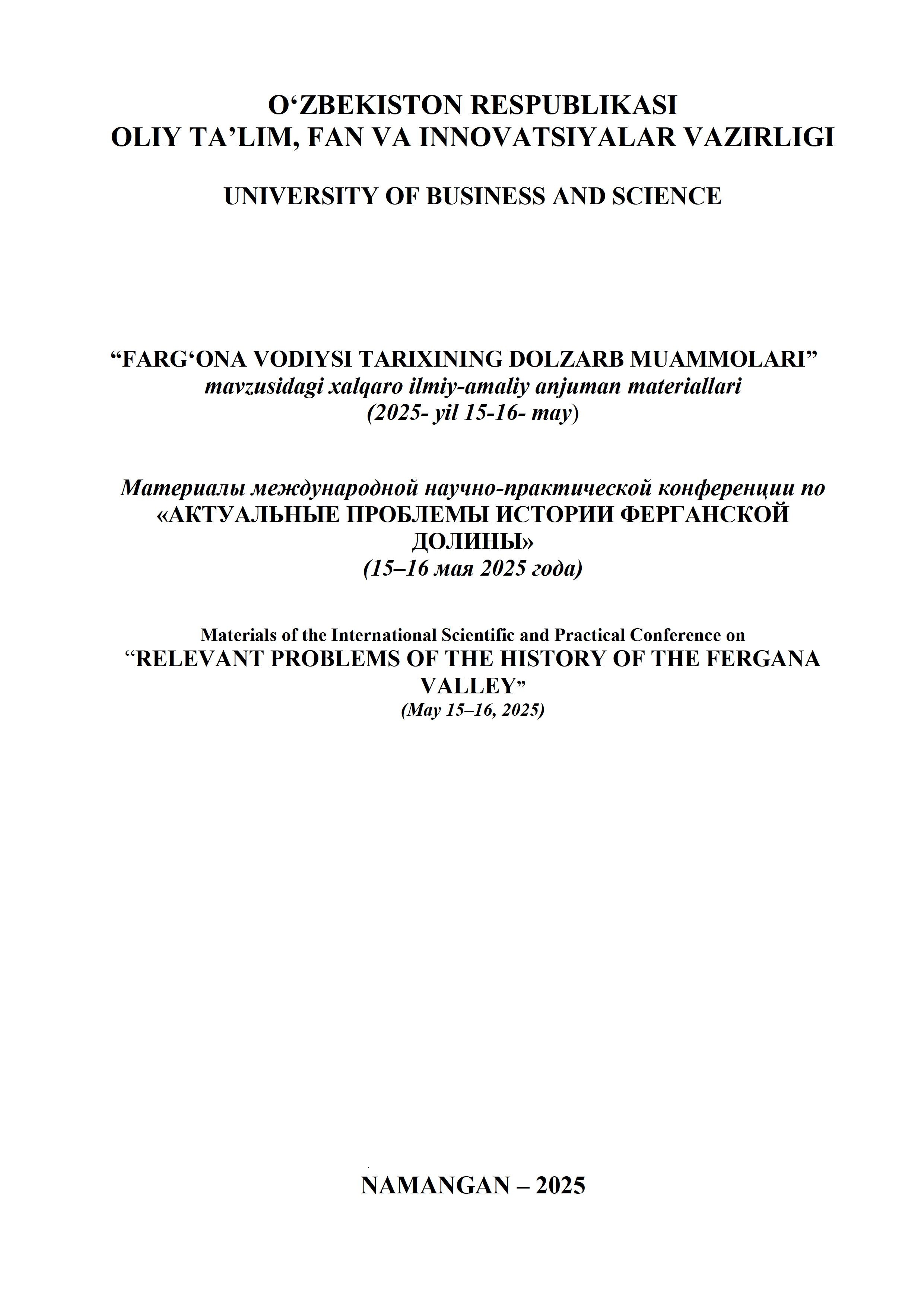 Ushbu to'plam University of Business and Scienceda nodavlat oliy ta`lim muassasasida Oliy taʼlim, fan va innovatsiyalar vazirining 2024- yil 27-dekabrdagi “490”- sonli buyrugʻiga asosan “2025- yilda xalqaro miqyosida oʻtkaziladigan ilmiy va ilmiy-texnik tadbirlar rejasi”da belgilangan “Farg'ona vodiysi tarixining dolzarb muammolari” mavzuidagi xalqaro ilmiy-amaliy anjumani materiallarini o'zida jamlagan. Unda Farg'ona vodiysi arxeologiyasi, etnologiyasi, o'rta asrlar, Qo'qon xonligi, Rossiya imperiyasi, sovet mustamlakachiligi, O'zbekistonning eng yangi tarixi davri muammolariga oid dolzarb mavzular doirasidagi rang-barang maqolalar keng kitobxonlar ommasi e'tiboriga havola qilingan.